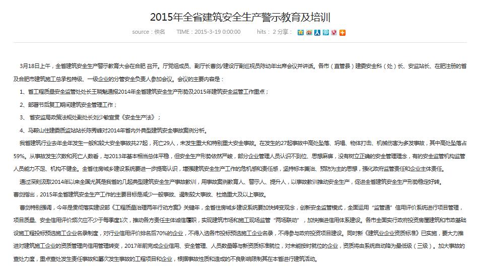 3月18日上午,全省建筑安全生產(chǎn)警示教育大會(huì)在合肥 召開(kāi)。廳黨組成員、副廳長(zhǎng)曹劍/建設(shè)廳副巡視員陳幼年出席會(huì)議并講話。各市(直管縣)建委安全科(處)長(zhǎng)、安監(jiān)站長(zhǎng)、在肥注冊(cè)的省及合肥市建筑施工總承包...