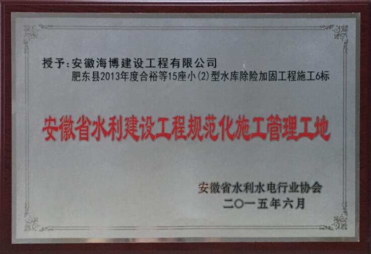 我公司承建的“肥東縣2013年度合裕等15座省級(jí)?。ǘ┬退畮?kù)除險(xiǎn)加固工程6標(biāo)”獲得 2014年度“安徽省水利建設(shè)工程規(guī)范化管理工地”的榮譽(yù)稱(chēng)號(hào)。 該工程為省級(jí)小(2)型水庫(kù)除險(xiǎn)加固項(xiàng)...