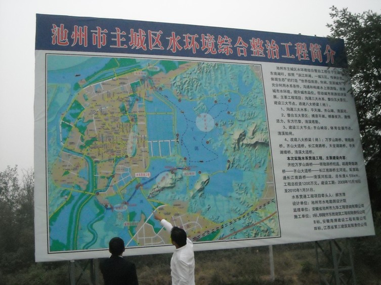 我公司承建的池州市重點市政工程——主城區水系貫通工程,已于10月18日正式開工。內容包括:疏浚河道4.54公里,(河道底寬20米,挖深3米)、生態護坡(三維土工網草皮護坡)、生態濕地、親水平臺(護砌高度達7.1~9.1米的硬護岸)、柳桉木的棧橋、棧道等。