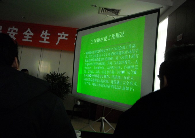 黨組書記張永安同志首先就肥西縣建設(shè)局發(fā)布的 “建設(shè)[2009]151號(hào),建設(shè)[2009]154號(hào),建設(shè)[2009]155號(hào)”文件中的工作進(jìn)行安排。接著解軍培同志講述了“百日會(huì)戰(zhàn)”開(kāi)展情況,并就安全檢查中存在的隱患以幻燈片的形式展示給參會(huì)企業(yè),讓企業(yè)領(lǐng)導(dǎo)體會(huì)在建項(xiàng)目安全隱患的嚴(yán)重性以及安全隱患處理的緊迫性。李紹敏同志就施工報(bào)建、安全生產(chǎn)、農(nóng)民工工資等問(wèn)題提出存在的問(wèn)題及整改要求,重點(diǎn)對(duì)施工用電、臨邊防護(hù)、腳手架搭設(shè)及地面硬化、施工機(jī)具現(xiàn)場(chǎng)防護(hù)及現(xiàn)場(chǎng)施工人員的安全意識(shí)等方面存在的問(wèn)題進(jìn)行批評(píng)和教育,要求企業(yè)領(lǐng)導(dǎo)一定要在安全生產(chǎn)過(guò)程中起帶頭作用,深入項(xiàng)目施工現(xiàn)場(chǎng),親自把關(guān),把整改措施落實(shí)到位。