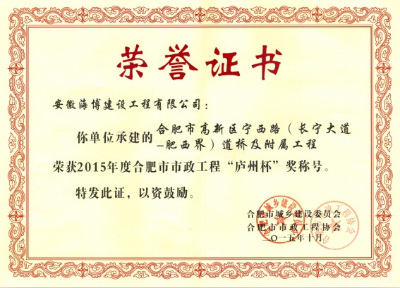 炎炎夏日,驕陽似火,我公司喜獲2015年度合肥市市政工程“廬州杯”獎,給酷熱的盛夏送來了陣陣涼意。由公司承建的合肥市高新區寧西路(長寧大道-肥西界)道橋及附屬工程經合肥市城鄉建設委員會及合肥市市政工程協會審定,順利獲得此次獎項。