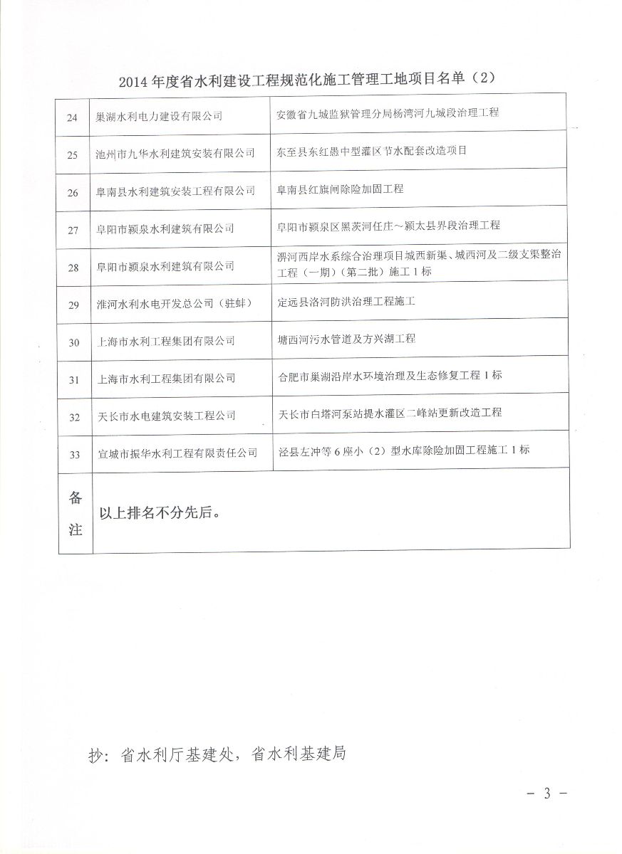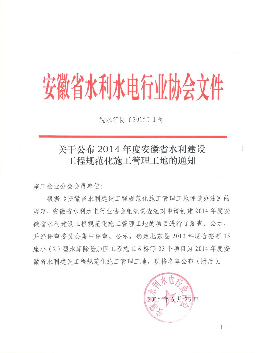 我公司承建的“肥東縣2013年度合裕等15座省級小(二)型水庫除險(xiǎn)加固工程6標(biāo)”獲得 2014年度“安徽省水利建設(shè)工程規(guī)范化管理工地”的榮譽(yù)稱號。