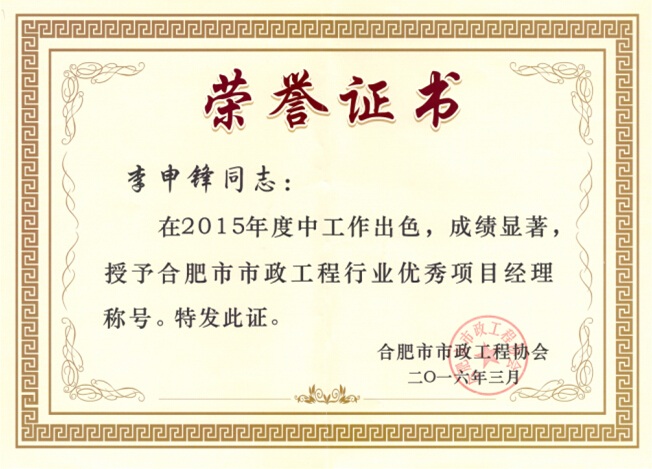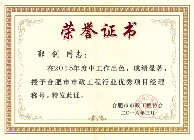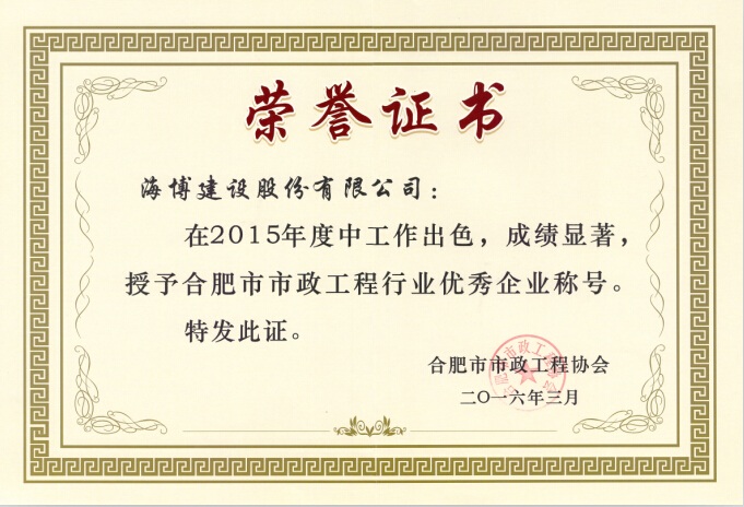 合肥市市政工程協會第三屆三次理事大會于昨日召開,會上對2015年度評選出的合肥市市政工程“優秀企業”和“優秀項目經理”進行表彰,海博建設股份有限公司榜上有名,并且我司李申鋒、郭劍兩位同志也榮獲“優秀項目經理”稱號。
