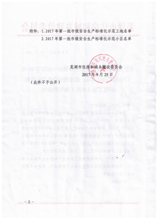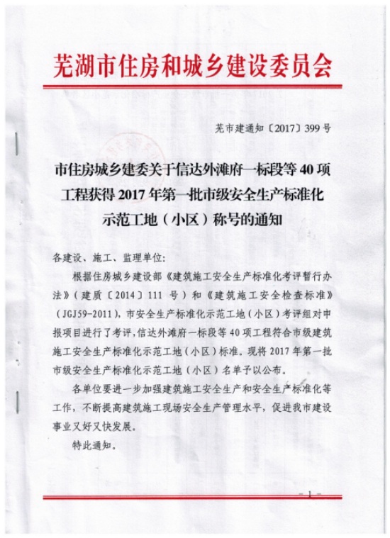 近日,經(jīng)蕪湖市安全辦領(lǐng)導(dǎo)、專家組成的安全標(biāo)準(zhǔn)化評審組嚴(yán)格、認(rèn)真地評審,我公司無為縣城東工業(yè)園區(qū)福東北路(緯一路-福貿(mào)路)工程獲得2017年第一批市級安全生產(chǎn)標(biāo)準(zhǔn)化示范工地稱號,也是蕪湖市目前唯一獲得該稱號的市政道路工程。